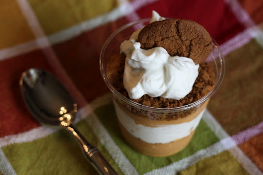 To assemble the parfaits, divide half of the pumpkin mixture into four cups. Sprinkle half of the gingersnap crumbs over the pumpkin. Spoon about half of the whipped cream over the gingersnaps in the four cups. Sprinkle with the remaining gingersnap crumbs. Spoon the remaining pumpkin over the gingersnap crumbs. Top with the remaining whipped cream. Garnish each parfait with a gingersnap cookie.