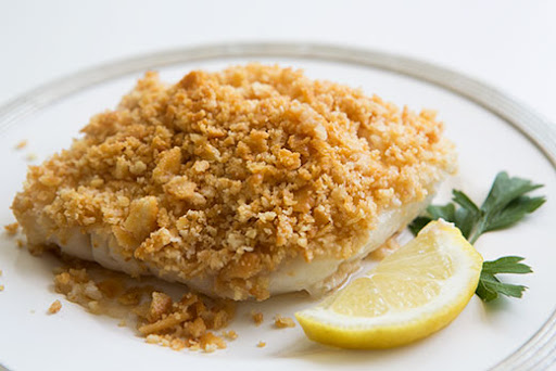 It's so easy, all you have to do is put the fish fillets in a baking pan, smother them with the topping, and bake. And the taste? Like lobster—infused with butter. Can you use a different cracker? I don't think so. You can, of course, but it just won't taste the same.