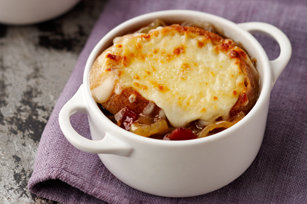 HEAT broiler. Ladle soup into 5 ovenproof bowls; top with toast and cheeses.