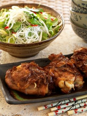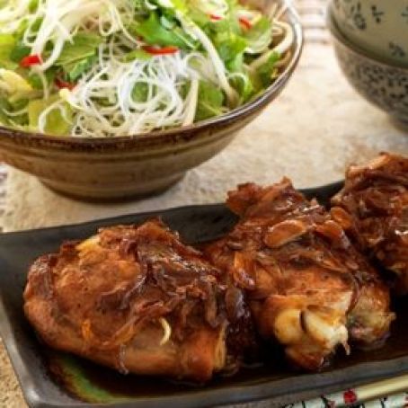 Place the chicken in a bowl with the oil, fish sauce, onion, garlic and pepper. Toss to combine. Heat large frying pan over medium high heat. Add chicken pieces and brown. Add soy sauce. Cover pan, reduce the heat to low and cook for 15 minutes, stirring occasionally. Increase the heat to med-high, add palm sugar, water and lime juice. Cook uncovered for 3 - 4 minutes, or until the sauce is rich and syrupy and chicken is cooked through. Garnish with lime wedges and coriander, and serve