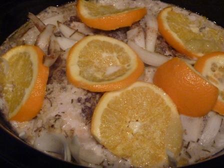 Place chicken in a large crockpot. Top with onions and garlic. Sprinkle with seasonings, add orange slices and pour coconut milk over the top. Cover and cook on low for 5-6 hours or on high for 3 hours. (With about 30 minutes left in cooking, add cornstarch mixture to thicken the sauce and allow to cook the remainder of the time.)