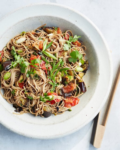 Combine eggplant, tomato, soba noodles, scallions, soy sauce, lemon juice, safflower oil, and sesame oil in a bowl. Season with salt. Refrigerate 1 hour. Stir in cilantro just before serving.