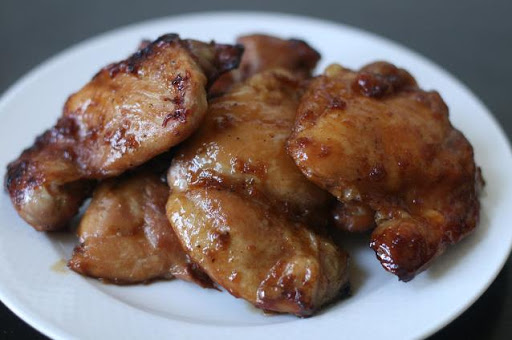 Preheat oven to 400. Heavily line a roasting pan with several layers of tin foil. (you will thank me for this step, because due to the nature of the glaze it will get burnt and stick forever without this precaution.) Lay the chicken thighs on the pan in a single layer. Place in oven and cook for 20 minutes, until cooked through.