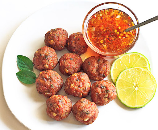 In a bowl, mix all ingredients together thoroughly with your hands. Roll into about 30-40 meatballs and place on pan. Bake until golden brown, about 20-25 minutes or until cooked through and not pink in the middle. While cooking, prepare the dipping sauce. In a mortar and pestle, crush garlic and red pepper into a paste. Place paste in a small serving bowl and stir together with agave nectar, fish sauce, lime juice and water. Serve meatballs with the Vietnamese dipping sauce, steamed rice and vegetables.