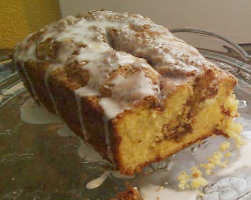 This is a recipe I found today on Cooks.com. I had a yellow cake mix and a vanilla pudding mix in my cupboard and wanted to dress those up some. The final product is a mix between bread and pound cake and is absolutely delicious! It is really easy to make, a huge plus for me and easy to chew - also good for me!