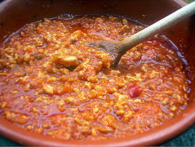 Add the tomatoes and bring the sauce to a boil and then add 1 cup of red wine Let it boil away for a few minutes. Turn the heat down to low and partially cover the saucepan. Let it blip away slowly and gently for a good 2 1/2 hours, stirring often.