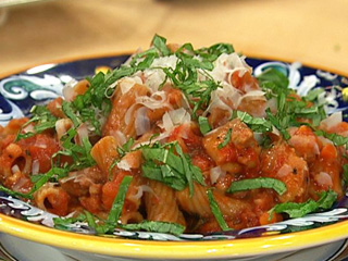 4. Drain the pasta and toss with the chicken ragu and cheese. Discard the bay leaf. Garnish with some torn basil. Serve immediately.