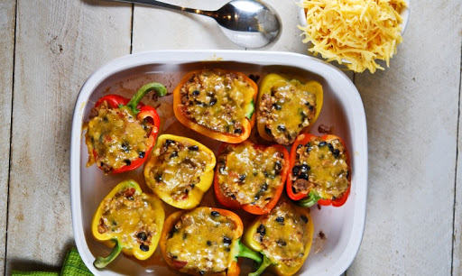 4. Fill peppers with filling. Bake about 45-50 minutes or until the peppers are soft. Remove from oven and top peppers with cheddar. Return to oven and cook until cheese is nicely melted.