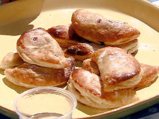 Place pies on a buttered oven tray. Repeat with the rest of the pastry dough. When all of the pies are on a sheet tray cut air holes in the top of each pie and brush the tops with egg wash. Sprinkle with the cinnamon sugar. Bake for about 20 to 25 minutes until puffed and nicely browned.