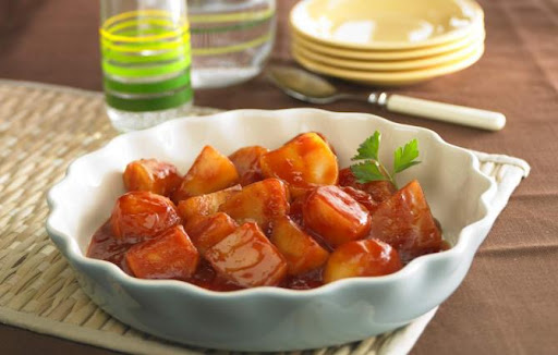 Place the ketchup, chili sauce, brown sugar, cider vinegar and lemon juice in a 2-quart saucepan. Heat over medium heat until boiling, stirring occasionally, about 2 minutes. Add the potatoes to the pot. Toss gently.