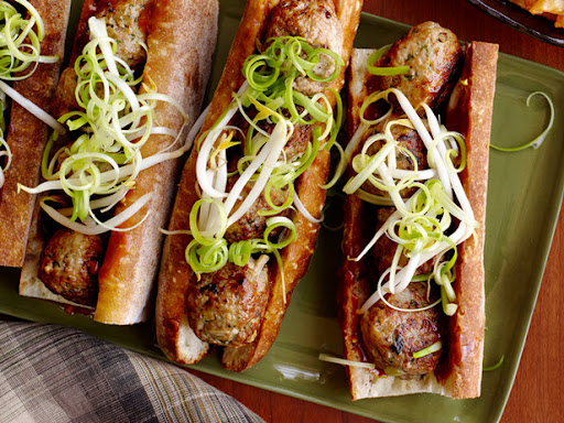 Drain the scallion greens and toss with the bean sprouts, the remaining 1 tablespoon lime juice and a pinch of salt in a bowl. Spread the hoisin mayonnaise on the inside of the baguette pieces, then fill with the meatballs and top with the scallion-sprout mixture.