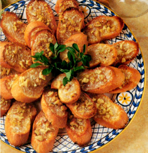 Heat broiler, Grate cheese. Combine 1/2 cup cheese, 1/4 cup walnuts and the salt in a food processor. Process until finely chopped. Add 1/4 cup olive oil and process until fairly smooth. Cut bread on the diagonal into 24 slices. Brush on both sides with remaining 1/2 cup oil. Toast the bread on a baking sheet under the broiler, about 30 seconds per side. Remove from oven and spread one side with walnut and cheese mixture. Sprinkle with remaining cheese. Press remaining walnuts on top. Broil until cheese begins to melt, about 30 seconds. Serve Immediately.