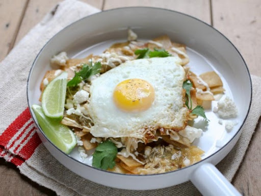 4. To build your chilaquiles, plate a generous pile of fried tortillas and top with the tomatillo smothered shredded chicken. Drizzle over some crema, sprinkle some cilantro leaves and white onion, crumble some cheese over top and finally top it all with a beautifully fried egg. Serve with lime wedges and additional hot sauce on the side.