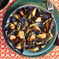 3. Add the butter to the mussels and shake the pan to melt it into the sauce. Serve with the bread for mopping.
