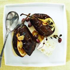 Insert the lemon slices into the slit in each eggplant, then press some garlic and oregano into each slit. Season with the salt and pepper.