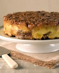 5.Place pan in a roasting pan and pour hot water to come halfway up the side of the pan. Bake 1 1/4 hours or until a knife inserted in the center comes out barely clean. Do not overbake. Let stand 5 minutes then run a metal spatula around the edges and invert the pudding onto a large rimmed plate.