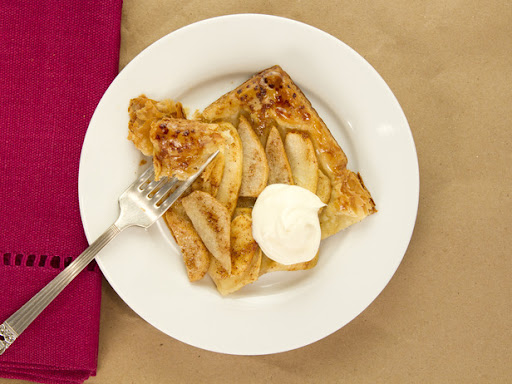 Arrange the pear, and apple slices on top of the pastry in 4 rows or diagonally, overlapping fruit slices and avoiding the border. Brush the fruit with melted butter and top with cinnamon-sugar. Bake the tart for 15 minutes, or until the pastry is golden brown and beginning to puff.