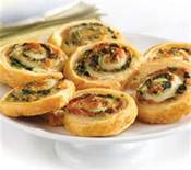 These tempting appetizers look like they're difficult to make...but they're not. They feature a spinach, onion and cheese filling simply rolled up in flaky puff pastry and sliced into pinwheels.