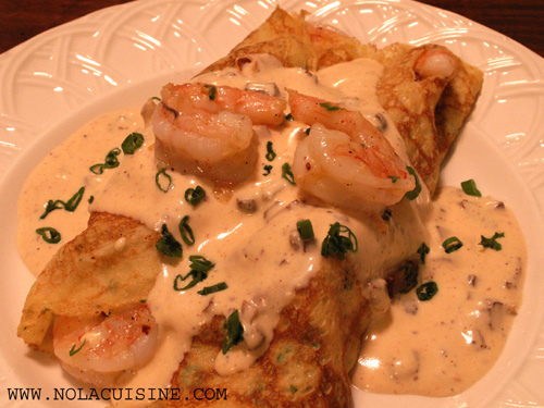 What's for dinner? Crepes stuffed with shrimp sautéed in butter, garlic and green onions smothered in a generous portion of Tasso Cream Sauce.