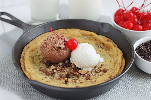 Lightly butter the cast iron skillet. If using an 8-inch cast iron skillet (like me) you only need to add half of the cookie batter to the pan (you can make two!). If you want to bake the entire amount in a larger skillet, you totally can; simply adjust the baking time. Spread the cookie dough so that it's just a few inches from the edges.