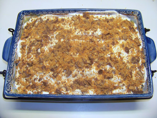 When chilled, spread Cool Whip over the cake. Sprinkle candy bar pieces over top.