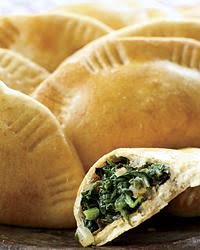 4.On a lightly floured surface, roll each ball of dough to a 5-inch round. Spread the spinach filling over half of each round, leaving a 1/2-inch border. Brush the rims with water and fold the dough over to enclose the filling; pinch the edges to seal.