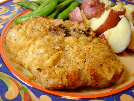 Dip the pork chops, individually, in the flour and shake off the excess. After flouring, dip in egg mixture and immediately dredge in breadcrumbs until the pork chop is well-coated; set aside.
