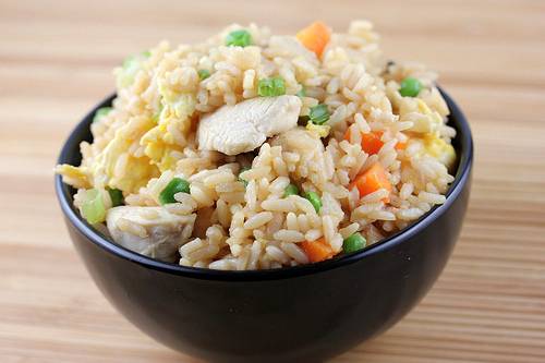 2: Add 1 teaspoon of sesame oil and one teaspoon of vegetable oil to the wok. Stir fry diced onion and garlic for 30 seconds, add peas and carrots mix and stir fry until vegetables are done to desired tenderness.