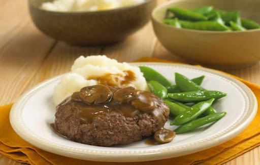 “Hearty beef patties are accented with zesty onion and fresh sage and smothered with fresh mushrooms simmered in gravy.”