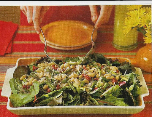2. Whisk together garlic and next 8 ingredients in a medium bowl; add asparagus, tomatoes, beans, onions, and capers, tossing to coat. Cover and chill 1 hour. Serve asparagus mixture over salad greens; sprinkle with cheese.