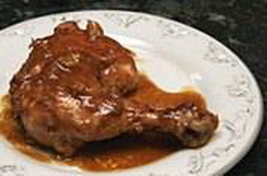 Bake in a preheated 325° oven for about 1 1/2 hours, or until chicken is tender and juices run clear. Baste with sauce occasionally while the chicken is baking.
