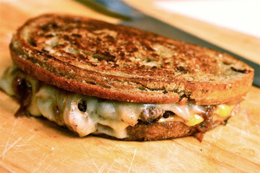 Since the bread and cheese element of the sandwich are essentially the same as a grilled cheese, why not use the standard grilled cheese method? Well there's a problem with it. It lies in the fact that because of the massive amount of air space in a slice of bread, it makes a really good insulator. That means that it takes a long time for the cheese to melt; if you're not careful, you can burn the outside of the sandwich before the center's even had the chill taken off of it. How do you solve this problem?