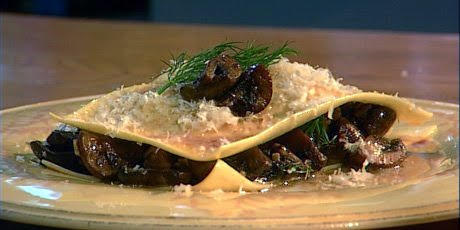 3. Generously salt the pasta water once it's boiling. Add the pasta and cook al dente. Drain, then return the pasta to the pan, tossing with the reserved brown butter. Lay a sheet of pasta on each of four serving plates. Spoon the mushrooms onto the pasta. Top with a second pasta sheet. Drizzle over the brown butter. Garnish with a dill sprig, and serve immediately.