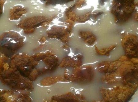 4 tear up bread and or donuts place in greased baking dish 9x13 casserole. pour milk mix on top press down bread so all is covered.
