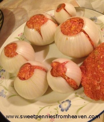 Now it’s time to assemble your onion bombs. Start with the largest pair of onion halves. Make a large meatball and place it in one side of the onion half and place the other onion half over the top. Basically squishing the meatball between the 2 onion halves. Continue to fill the rest of the onion halves up with the meat mixture.