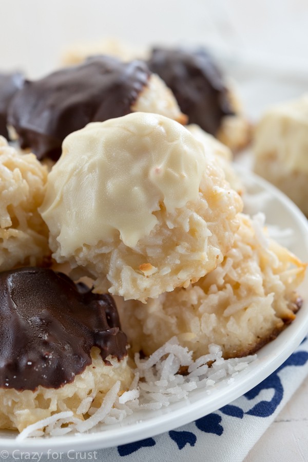 These are the BEST Coconut Macaroons! Bakery-style, perfect, and dipped in chocolate! They are egg-free, soft, chewy, and FULL of coconut. Omitting the eggs from these Coconut Macaroons makes them more dense and the perfect bakery style cookie!