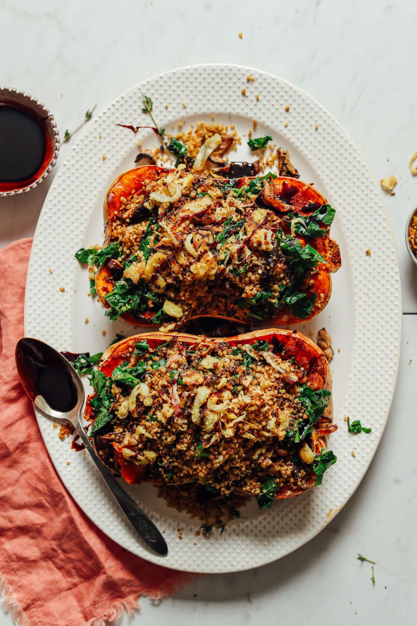 Roasted stuffed butternut squash makes the perfect plant-based entrée or side for the holiday season (and beyond). Stuffed with, quinoa, kale, and mushrooms; 10 ingredients required; and incredibly flavorful!
