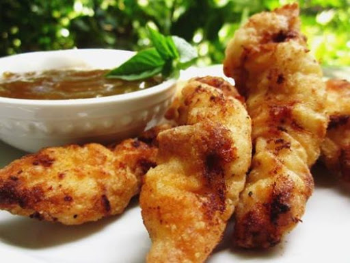 5 Preferably using an electric skillet, heat oil to 375 degrees F, then fry chicken, 3 or 4 strips at a time, on each side for 2 to 3 minutes or until golden brown. Drain the cooked strips on several layers of paper towels, & when finished, serve with the lemon dip, if using as an appetizer, or layer the fingers over a side of brown rice & top with the lemon curd mixture.