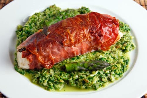Prosciutto Wrapped Halibut on Asparagus Sauce