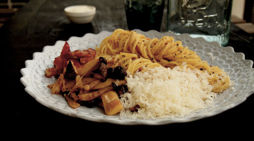 Heat a skillet over medium heat, brown bacon. Add mushrooms; cook until brown. Remove the bacon and mushrooms from the skillet. Reduce the heat to low. Add garlic oil (including pieces of garlic) and red pepper flakes; cook for about 2 minutes or until fragrant**. Return the bacon and mushrooms, and add 1 Tablespoon of the Boiling water from Pasta pot and Japanese Pasta Sauce. Shake the skillet to emulsify the sauce.