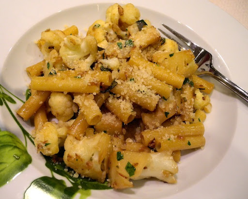 Pour the ziti into a large, deep, ovenproof casserole. Stir in half of the cheese. Add the cauliflower mixture and mix gently. Sprinkle with the remaining cheese. Crumble the bread crumbs on top and drizzle with the remaining 1 tablespoon of olive oil. Bake for 30 minutes. Remove from oven, grate more cheese over the top, and serve immediately.
