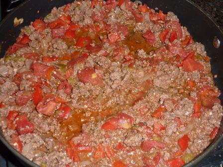 Heat oil on medium heat in a large pan. Add veggies and cook for about 2 minutes. Add meat and seasonings and cook for 10 minutes, stirring often. Add stewed tomotoes and cook another 10-15 minutes or until sauce thickens.