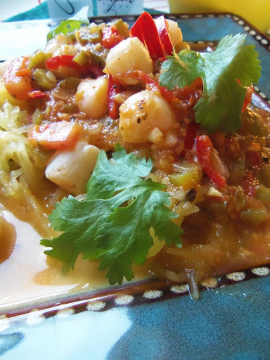 3. Add in the scallops, vodka and butter, stir to combine. Cook for just 3 to 5 minutes more, taste for salt. Serve over roasted spaghetti squash or your favorite pasta. Garnish with chopped cilantro and lemon wedges.