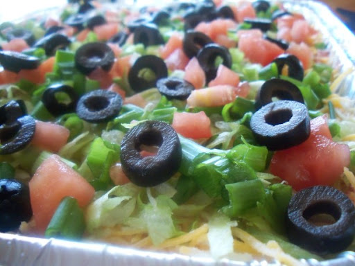 2. Layer beans on bottom of cake dish, then sour cream mixture, add shredded cheese and any other toppings.