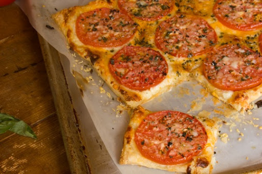 Spread a thin layer of mayonnaise over the entire puff pastry. Sprinkle evenly with shredded cheddar and mozzarella cheeses. Arrange the tomato slices over the cheese. Season generously with kosher salt and pepper. Grate a generous amount of Parmesan cheese on top and garnish with freshly chopped basil.