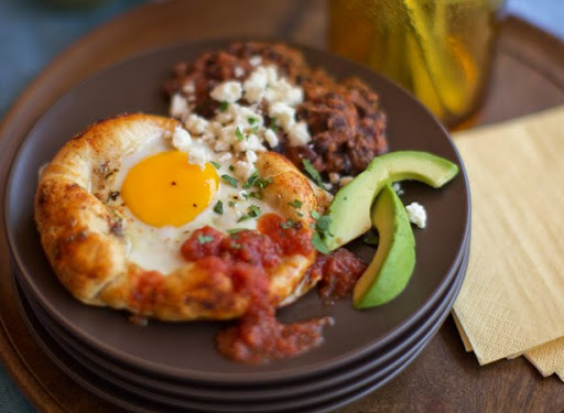 For a new take on huevos, try your eggs baked right in a pastry. This dreamy crescent tart is seasoned with chipotle powder and oregano and served with black beans, fire-roasted tomato sauce, cilantro and queso fresco. Buenos dias, indeed.