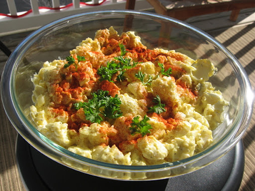 6. Gently stir yolk mixture into potato mixture; adjust seasoning to taste with salt and pepper.
