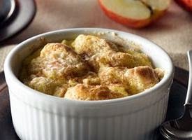 3. In small bowl, beat cream cheese, 1 tablespoon sugar and egg yolk until smooth. Beat in milk and vanilla; stir in apple. Pour mixture over biscuit pieces in custard cups; stir gently to mix well. In small bowl, mix 1 teaspoon sugar and the cinnamon; sprinkle over custard mixture.