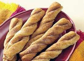 4. With sharp knife or pizza cutter, cut each rectangle stack lengthwise into 6 strips. Twist each strip 3 times; place on ungreased cookie sheet.