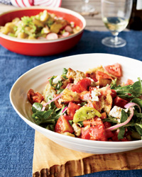 Add the bread and arugula to the tomatoes along with the ricotta salata and toss to combine. Serve right away.
